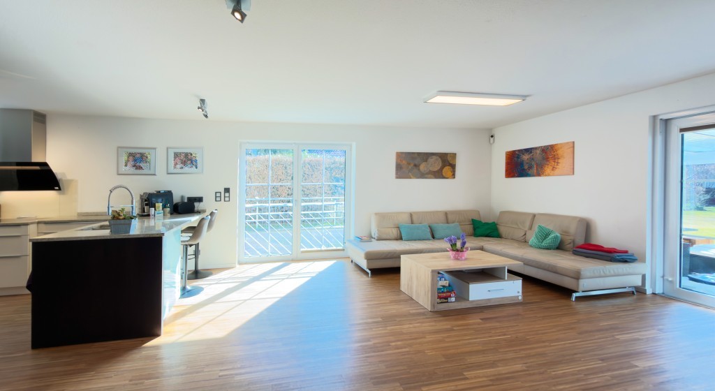 • ca. 100 m² offener Wohn-, Ess- und Kochbereich mit eingehauster, ganzjährig nutzbarer Terrasse