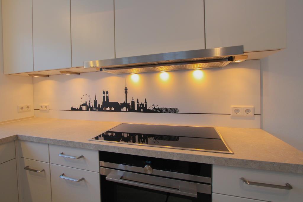 - Markeneinbauküche mit Tresen, Dekor weiß, große Arbeitsplatte, sehr viel Stauraum