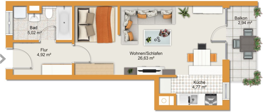 Sehr gut gestaltete ca. 43 m². Super Grundriss: