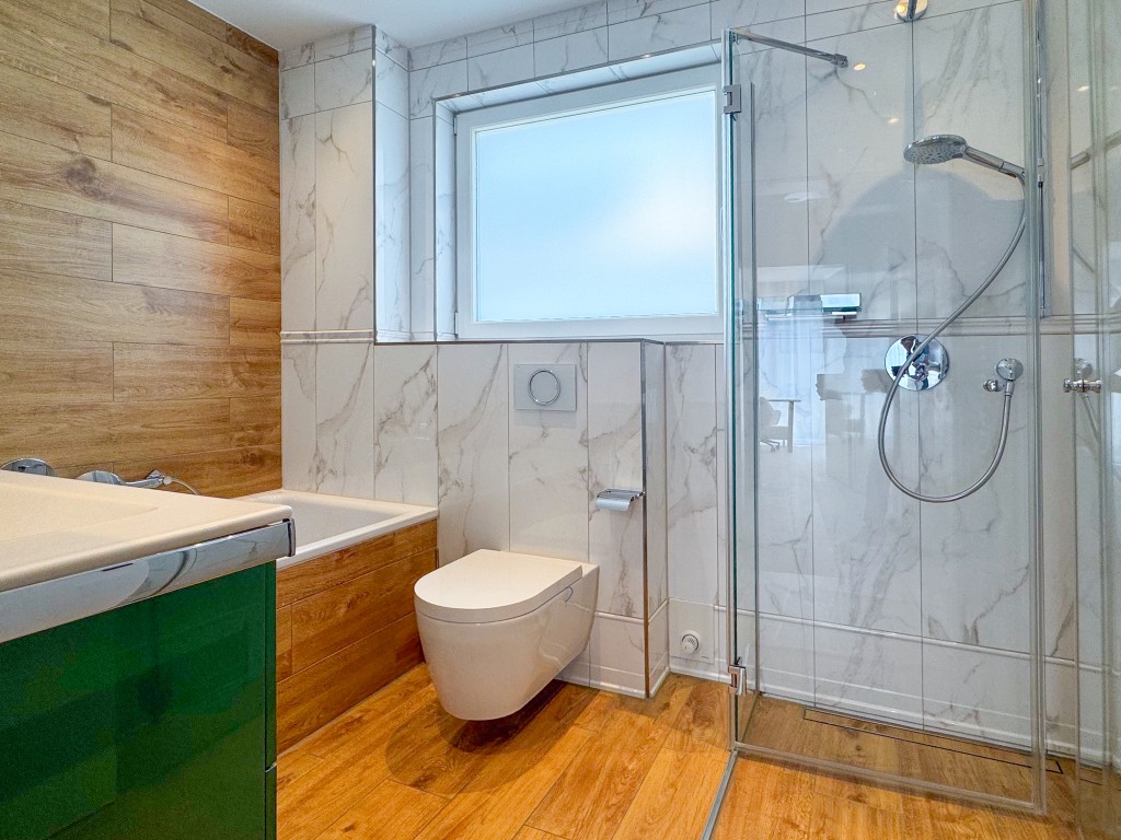- Tageslicht-Vollbad mit Wanne, bodengleicher Dusche, Waschtisch, WC
