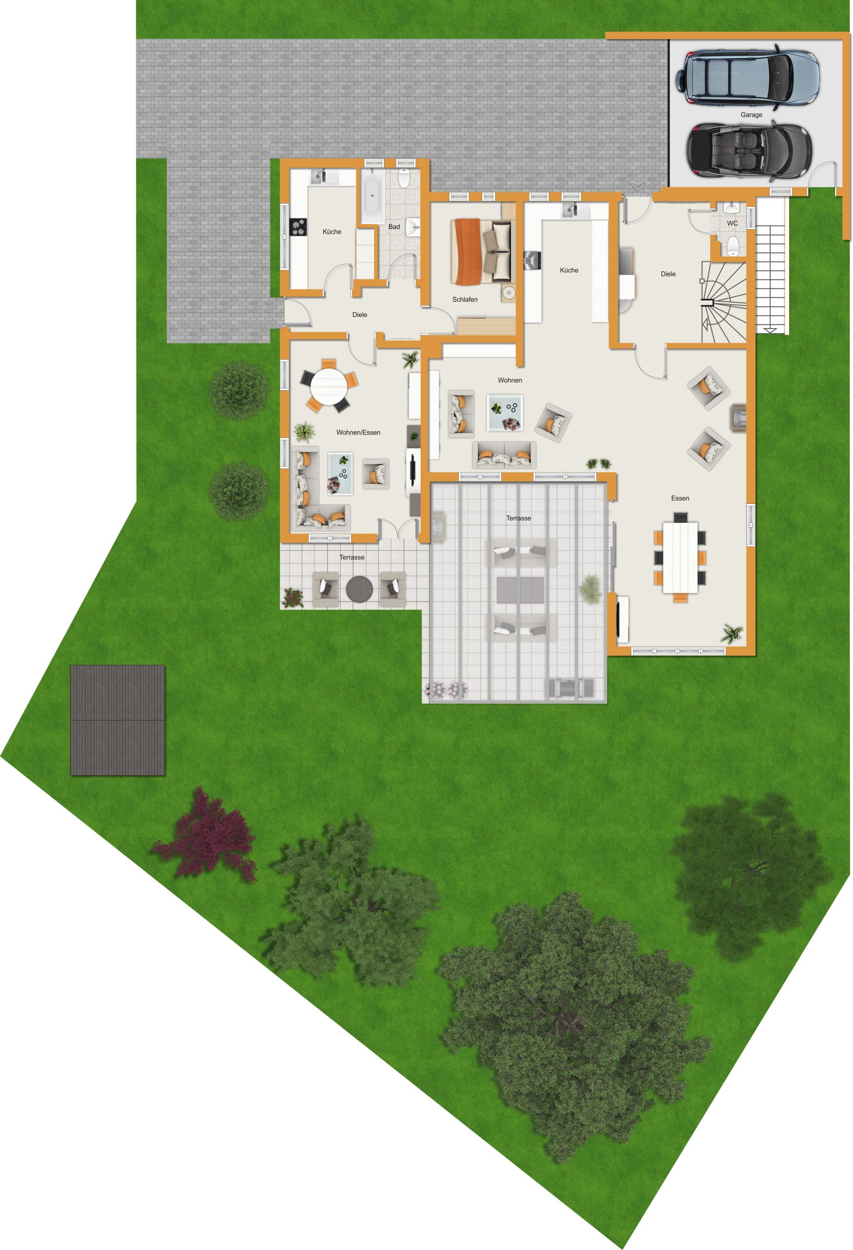 - Add-on: Große Doppelgarage für den Fuhrpark und große Gartenhütte für vieles Weitere.